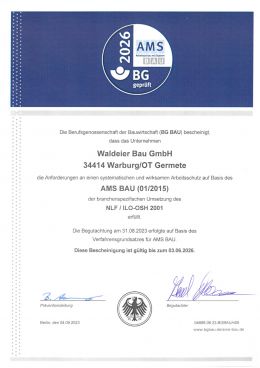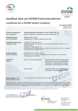Seit Juli 1978 ist die Firma Waldeier Bau GmbH im Besitz der Zulassung W3 des DVGW. Im Januar 1993 erhielten wir das Zertifikat als Rohrleitungsbauunternehmen nach DVGW GW301. Die Zulassung der Gruppen G2 und W1 + PE bescheinigt uns die nötige Fachkompetenz im Verlegen von Gas- und Wasserleitungen im offenen Graben. Diese umfassen die Verlegung von Gasrohrleitungen mit Betriebsdrücken bis 16bar und Nennweiten bis DN300 aus Gusseisen, Stahl und Polyethylen sowie die Verlegung von Wasserrohrleitungen aller Drücke und Nennweiten.