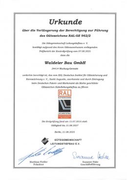 Die Zusatzzertifizierung nach GW321 (Horizontales Spülbohrverfahren) erwarben wir im März 2007, welche uns zusätzlich die Verlegung von Versorgungsleitungen im grabenlosen Verfahren bestätigt. Zudem erfüllen wir die Anforderungen des "Betrieblichen Qualitätsmanagements".
